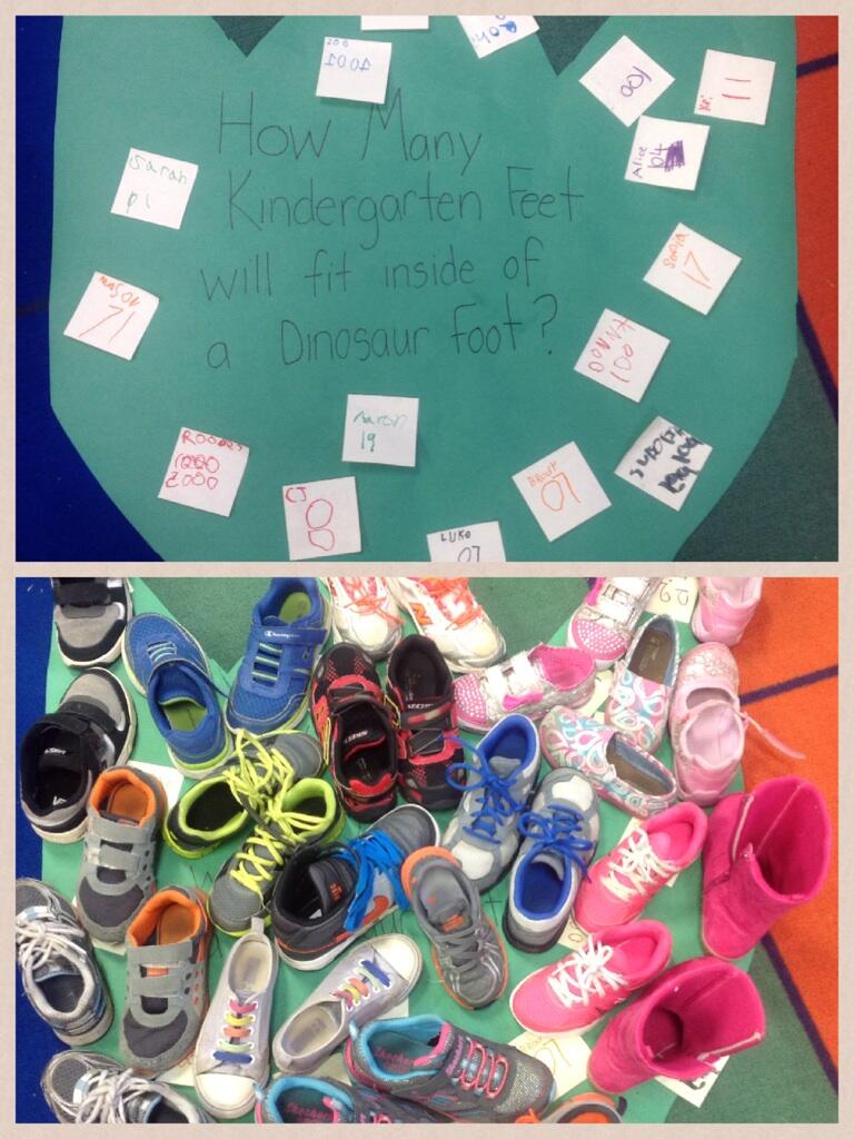 Not only did we predict and measure how many shoes would fit into the dinosaur footprint, we compared numbers using "greater then" and "less than" when we found the answer. Wow! These kids are SMART